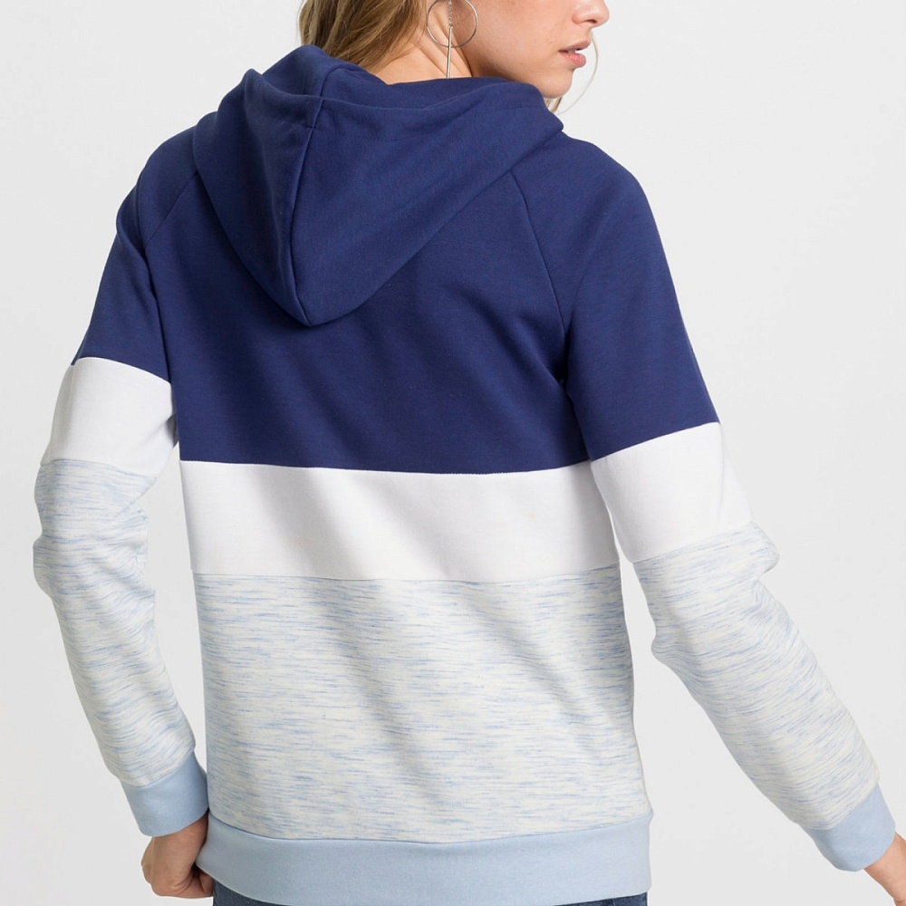 Капюшон с протянутым шнурком и двумя люверсами. Рукава-реглан и карманы-кенгуру. В стиле колор-блокинг.