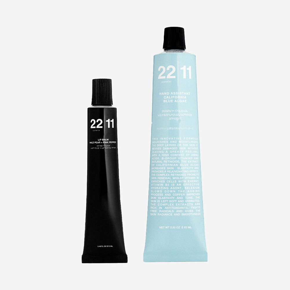 Набор 22|11 в минималистичной белой упаковке станет отличным подарком для тех, кто ценит натуральность в уходе за собой. В набор входит питательный бальзам для губ с нежным ароматом груши и экстрактом розового перца и крем для рук с экстрактом синей калифорнийской водоросли.