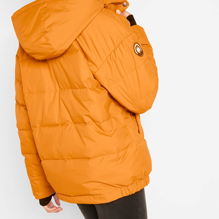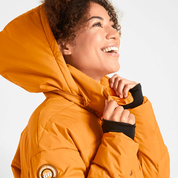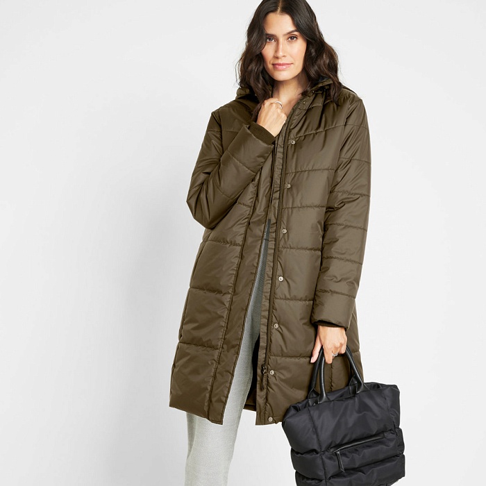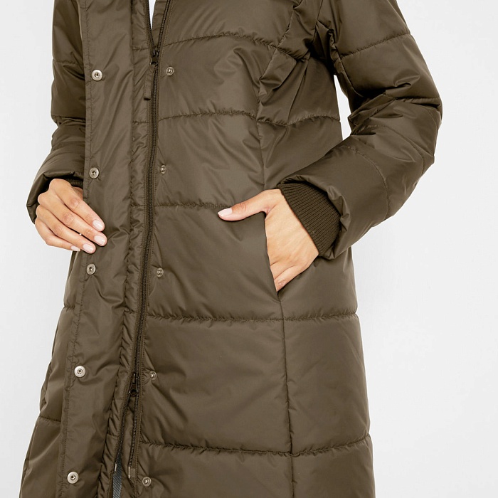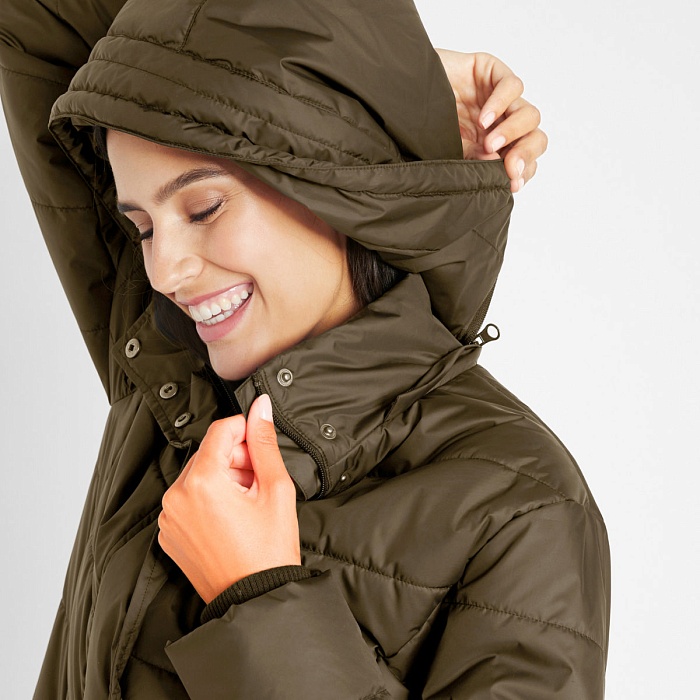 Утеплённое пальто с карманами и отстёгивающимся капюшоном.