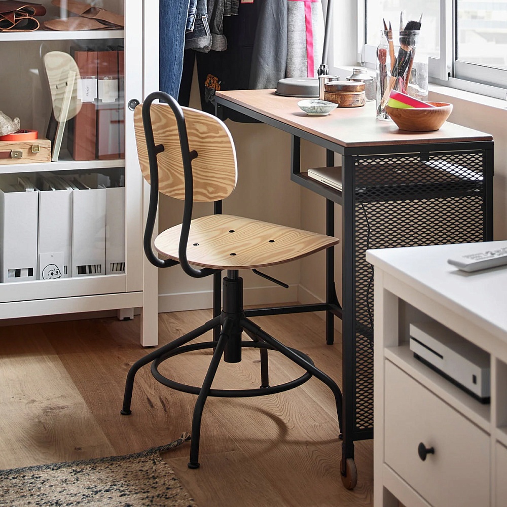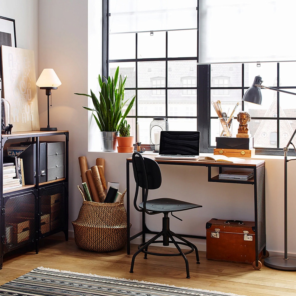 Этот лаконичный стол из металла и массива дерева станет комфортным рабочим местом даже в небольшом помещении.