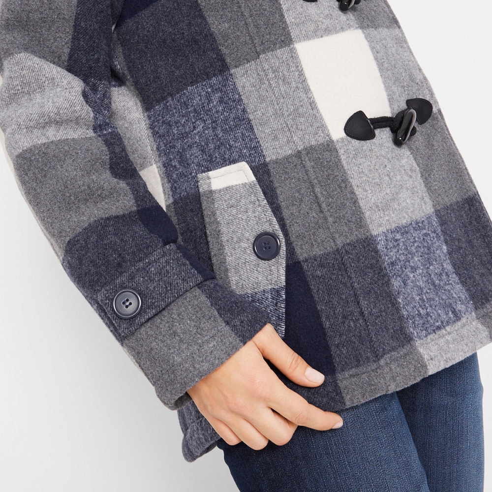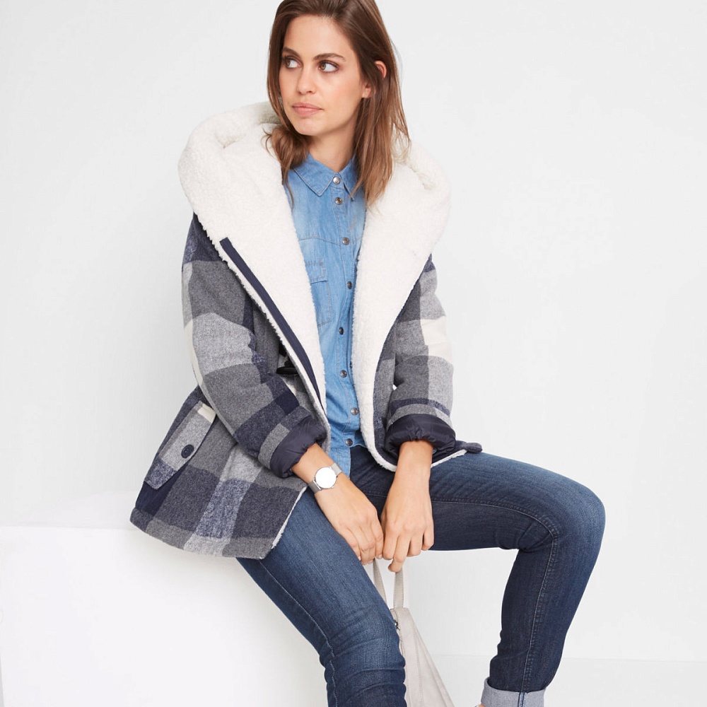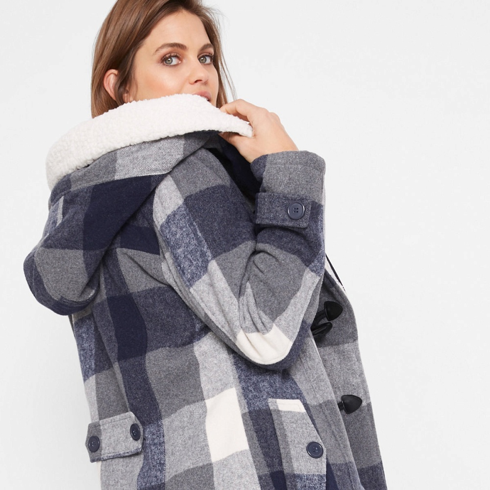 Уютное теплое полупальто на плюшевой подкладке. Дизайн в модную клетку. Большой капюшон. Застежка на молнию. Декоративные пуговицы. Зрительная длина 78 см