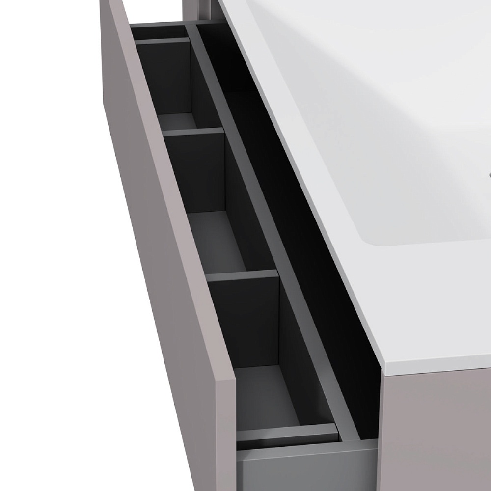Ультратонкая раковина эргономичной формы с покрытием из мрамора идеально сочетается с мебельной базой. Инновационный подход к хранению: мы разработали дополнительный ящик, который выдвигается на 12 см и обеспечивает быстрый доступ к самым необходимым вещам;